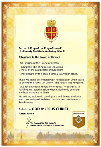 Augustos Leo Apolo, General of the Last Legion of Byzantium's Declaration of Protection to the Patriarch King of the Kingdom of Hawai'i.